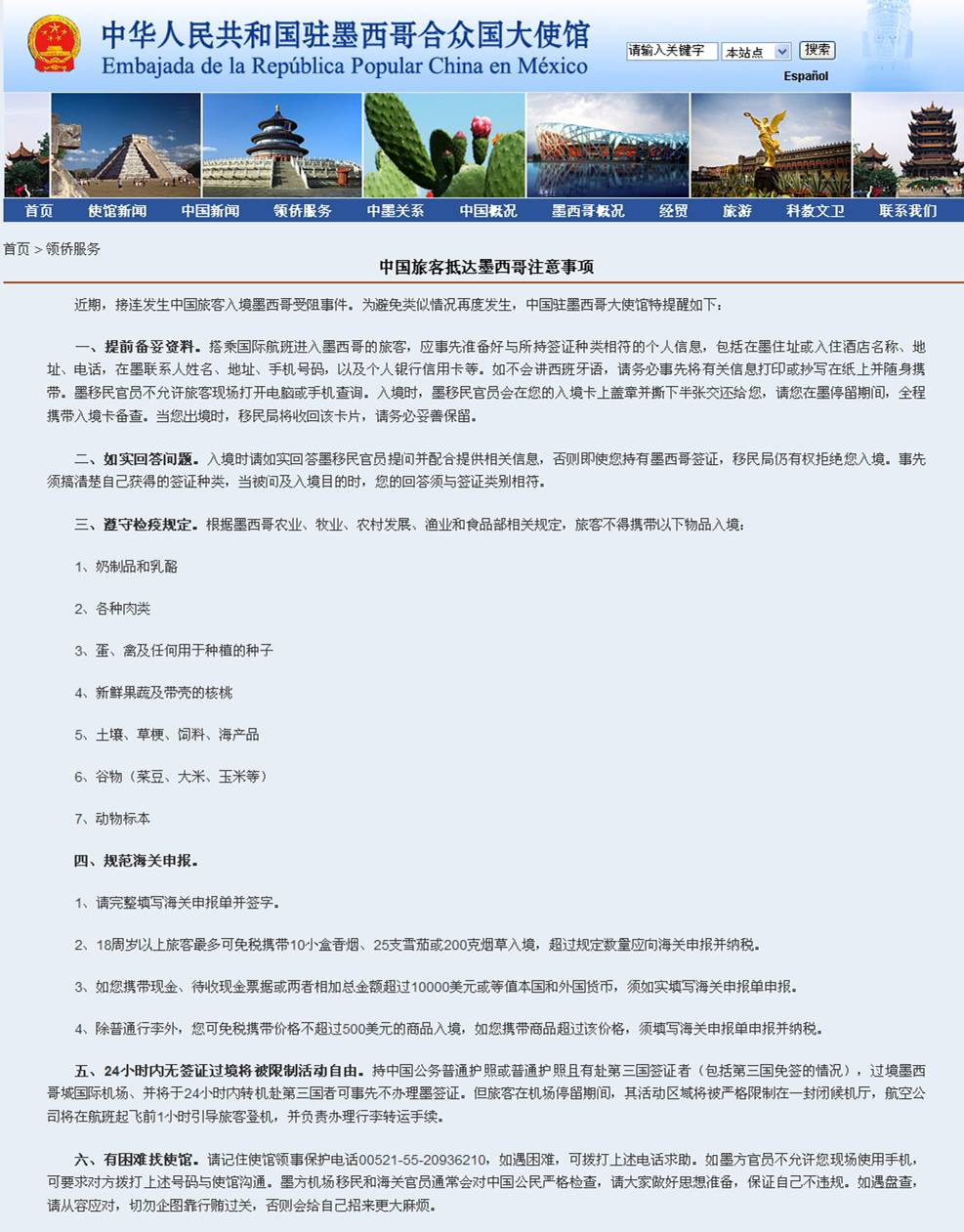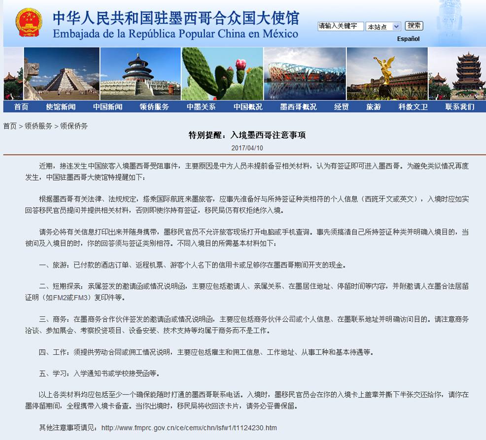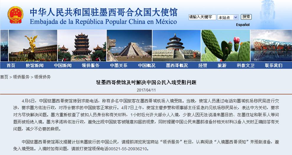 據中華人民共和國駐墨西哥合眾國大使館消息,4月6日,中國駐墨西哥使館接到求助電話,稱有多名中國旅客在墨西哥城機場入境受阻。當晚,使館人員通過電話向墨城機場移民局進行交涉,要求墨方依法行政,對符合要求的中國旅客正常放行。4月7日上午,使館主管參贊和領事部主任緊急約見機場移民局長,表達中方關切,要求對方盡快解決問題。墨方重新核查了被扣人員身份和有關材料,1小時后允許大部分人入境,少數人因無法說清來墨目的、在墨住址和聯系人等問題而被拒絕入境。墨方承諾將依法行政,避免出現中國旅客被隨意扣留的現象,同時提醒中國公民來墨前準備好相關材料以備入關時正確回答有關問題,減少不必要的麻煩。
